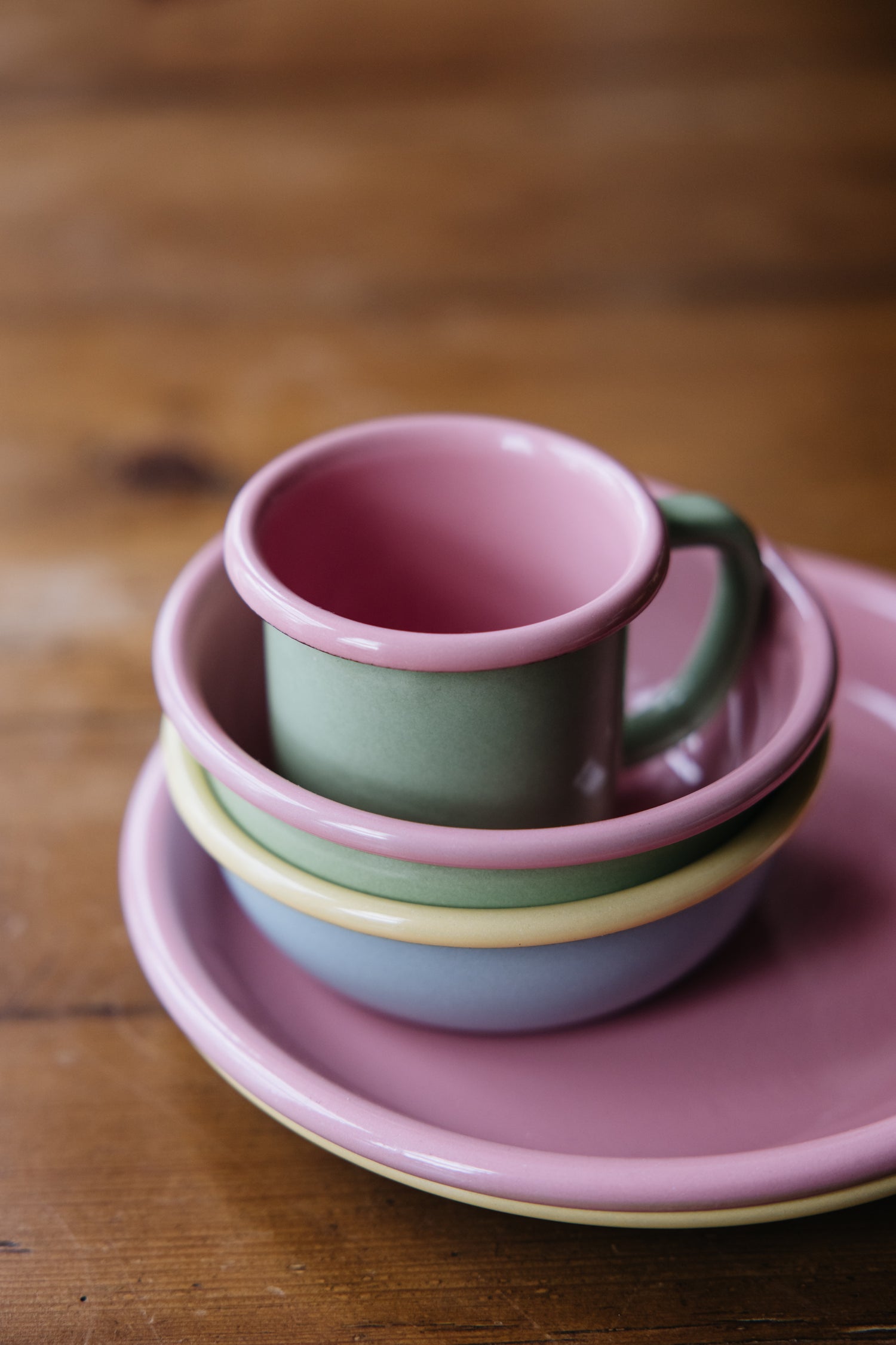 Partnering with a female founded enamelware company, Wicklewood has designed a custom range for everyday use. Every bit as colourful as it is practical.