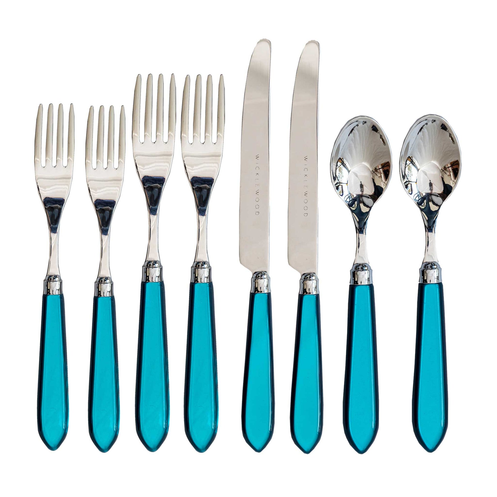 Coloured resin handles set with premium stainless steel, our cutlery is crafted in Thiers, France. In a rainbow of colours, these eye-catching pieces fuse elegant with fun, and they're all dishwasher safe. We love to mix the colours and pair with our hand-painted Italian plates.