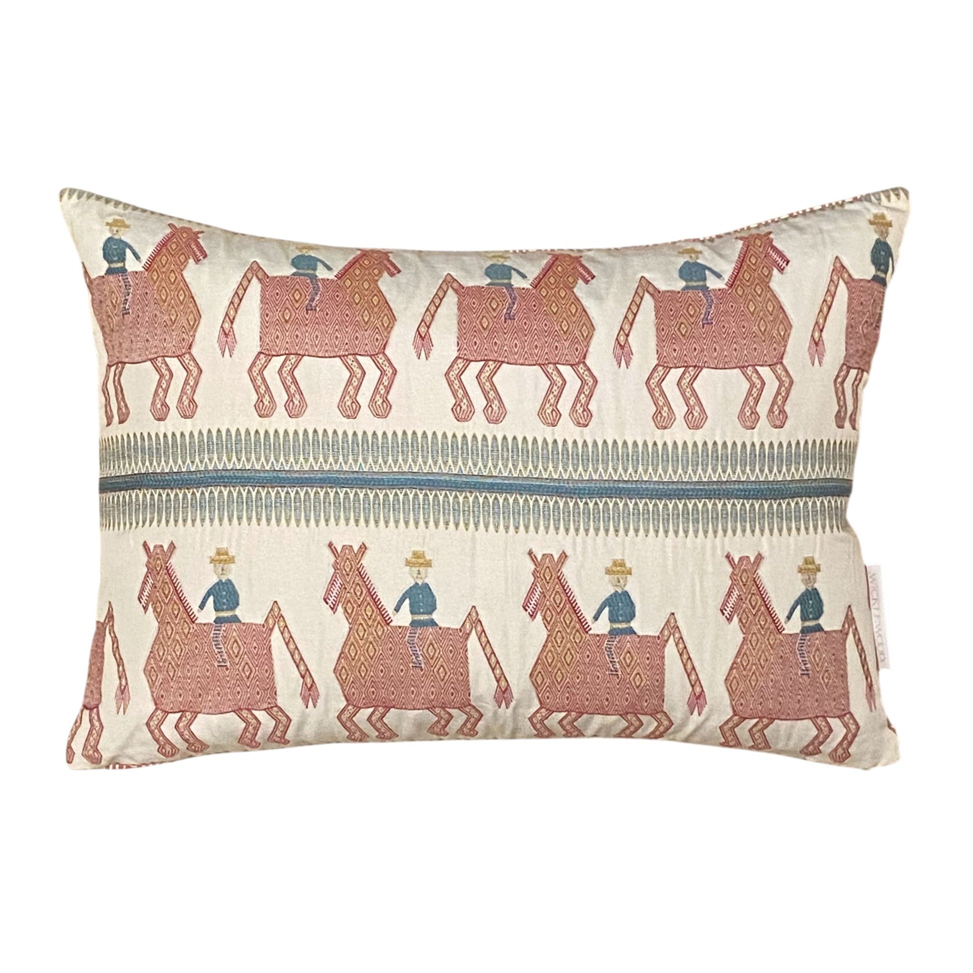 The Caballo cushion is crafted from Wicklewood's original fabric and inspired by Guatemalan textiles from the 1930s archive of Lilly de Jongh Osborne. The stylised horse and rider design is woven with intricate motifs which create a colourful and unique piece for your space, bringing heritage into your home.