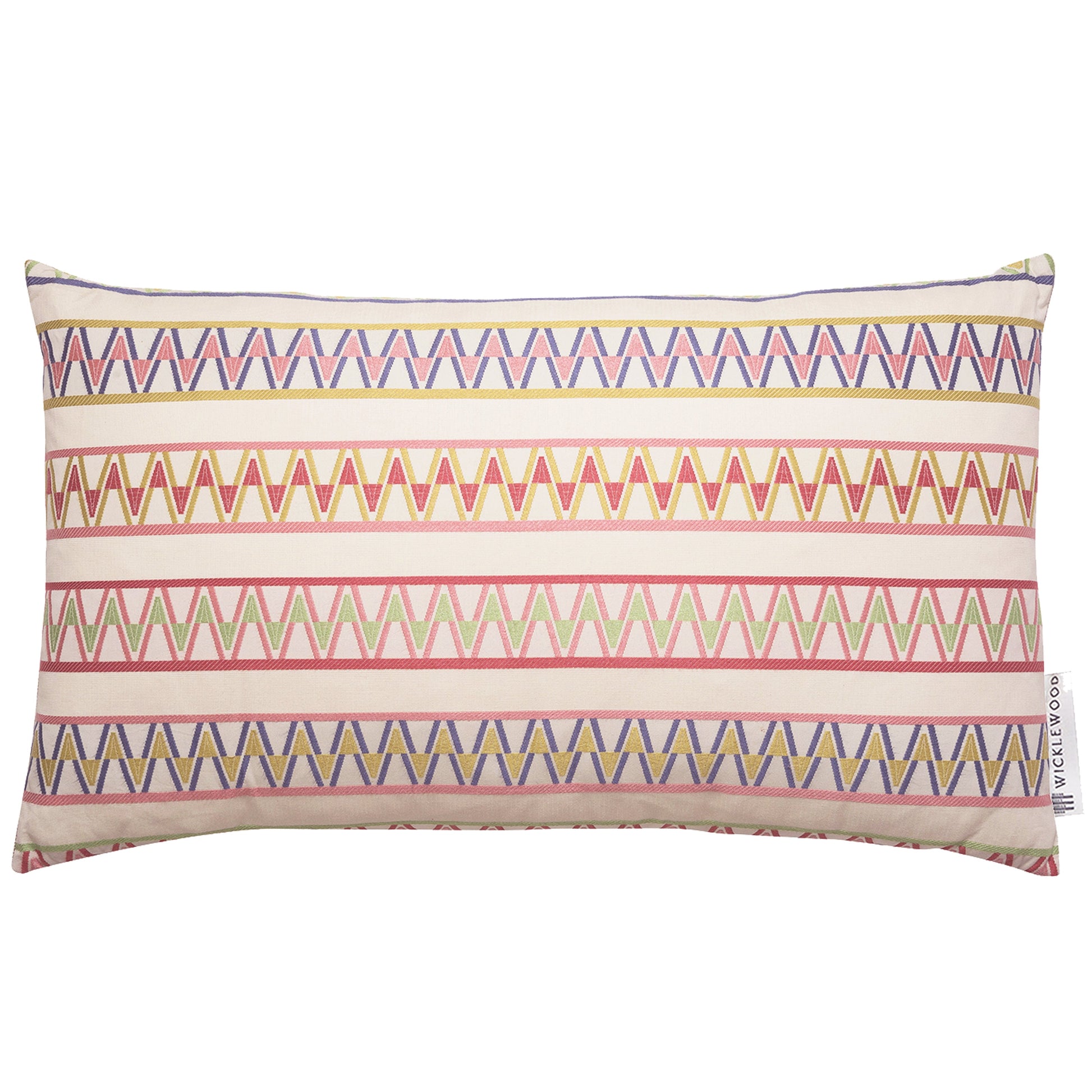 This oversized oblong cushion features Palopo, a Wicklewood original design, backed in our namesake Blithfield design, ‘Wicklewood’ in blue This multicolour zig zag is inspired by classic Guatemalan weaving motifs and is crafted into a cheerful cushion in a vibrant colour combination which looks perfect in contemporary and classic settings.