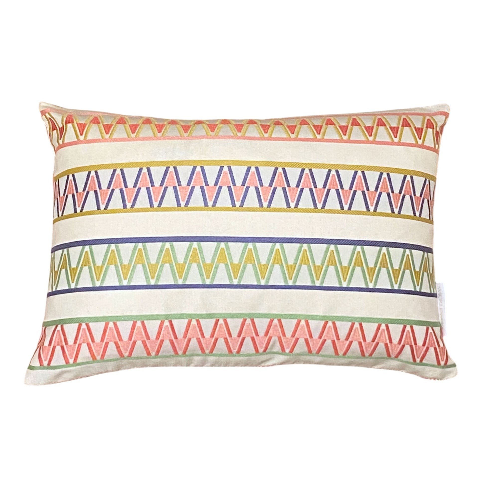 This oblong cushion features Palopo, a Wicklewood original design, backed in our namesake Blithfield design, ‘Wicklewood’ in blue. This multicolour zig zag is inspired by classic Guatemalan weaving motifs and is crafted into a cheerful cushion in a vibrant colour combination which looks perfect in contemporary and classic settings.