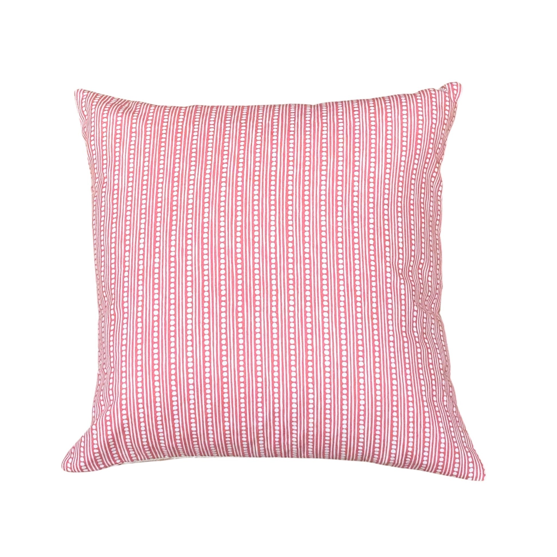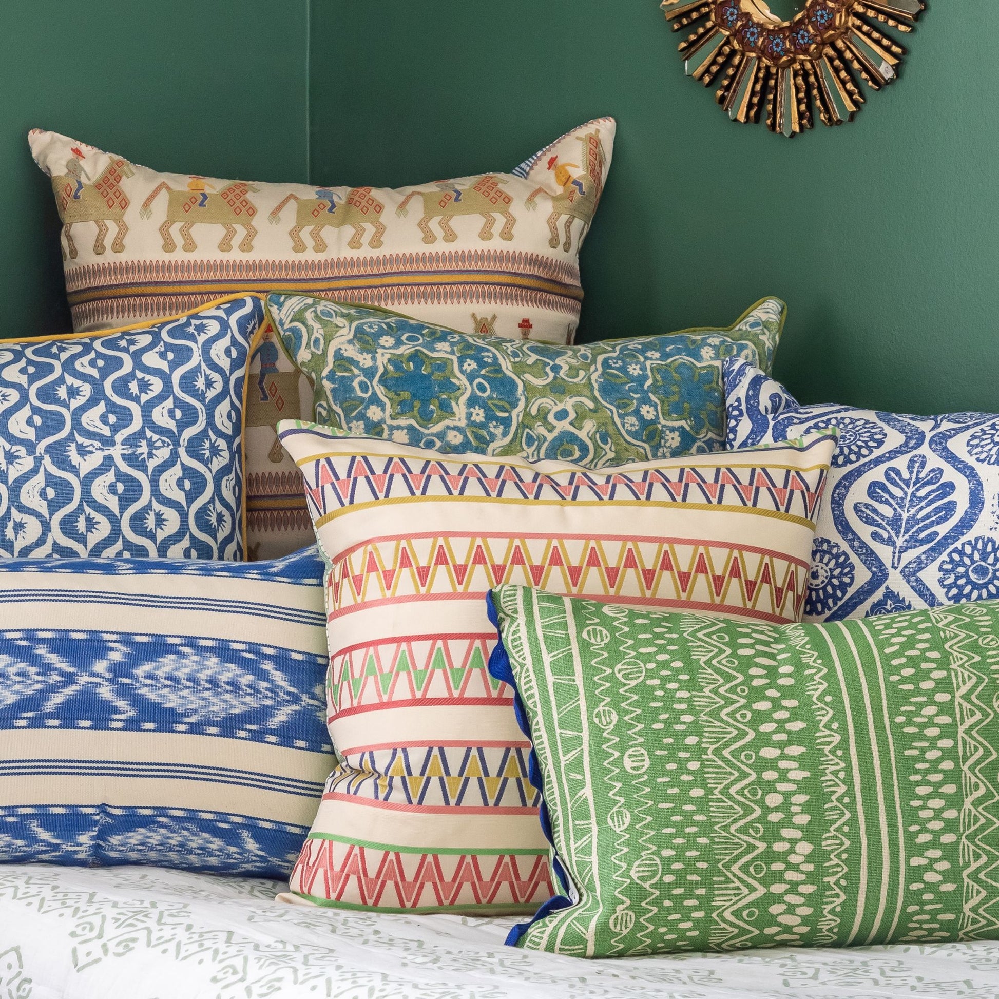 This cushion features Palopo one of our favourite designs, a multicolour zig zag inspired by original Guatemalan weaving motifs, backed in our namesake Blithfield design, 'Wicklewood' in pink, a lovely combination of dots and stripes, making this cushion versatile and reversible and perfect in contemporary and classic settings.